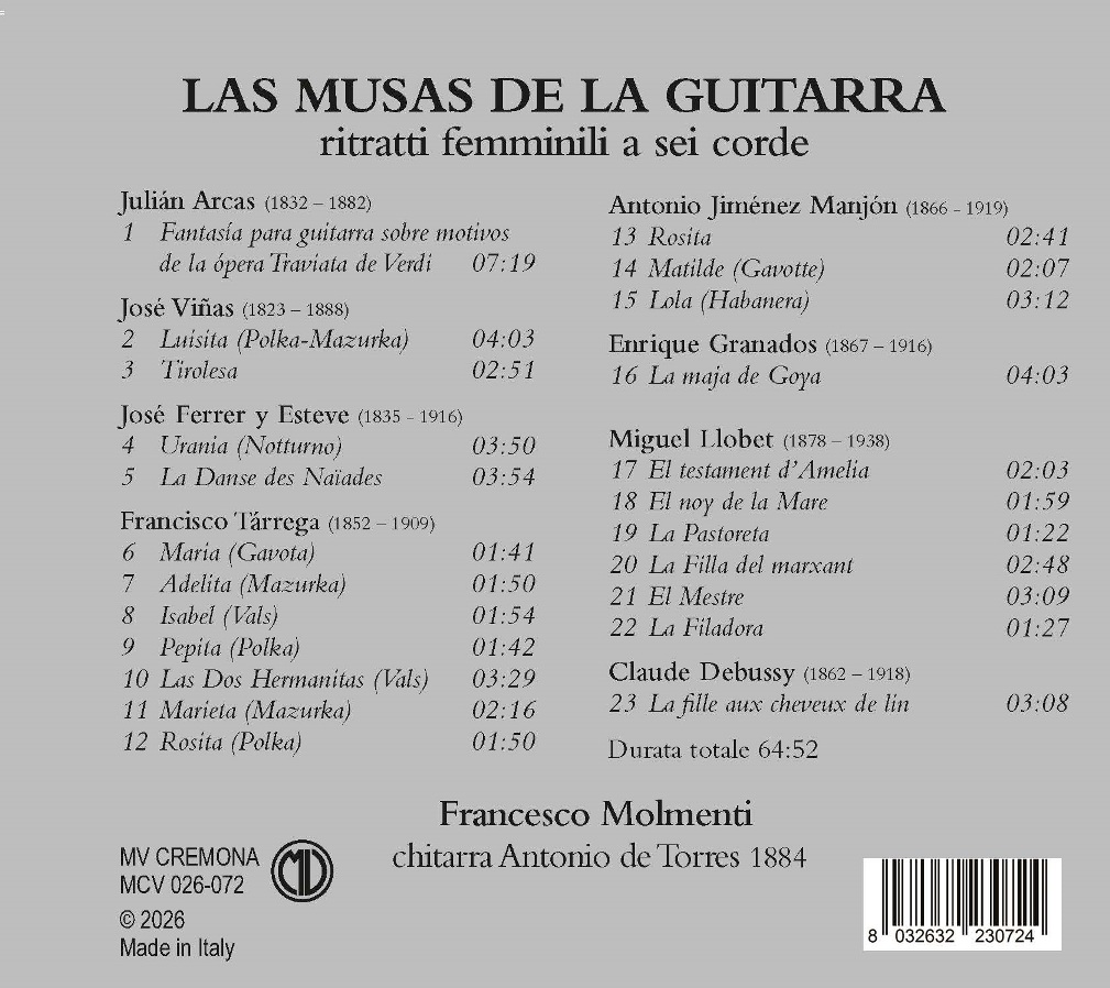 Early 20th Centuries Two elements give coherence and unity to the programme of this recording. First, all the selected pieces share the presence of a female name in their title; moreover, almost all the composers are of Spanish origin (with the exception of Claude Debussy) and lived during the period in which Antonio de Torres (Almería, 1817–1892) built his guitars. It is known that Julián Arcas, Francisco Tárrega, Miguel Llobet, and Antonio Jiménez Manjón played instruments crafted by Torres. Of the other composers, fewer biographical details are known, but the aesthetics of their works perfectly match the timbre and sensitivity of the nineteenth-century guitar. The programme also includes two compositions by non-guitarist composers: La maja de Goya by Enrique Granados and La fille aux cheveux de lin by Claude Debussy. The former, in Miguel Llobet’s transcription, is ideally connected to the selection of Catalan songs; the latter, conceived as a “bonus track,” is a poetic homage to the French composer and to his ideal dialogue with Spain — a country he never visited, yet deeply evoked, as in La soirée dans Grenade. Julián Arcas (María, 1832 – Antequera, 1882), a celebrated Spanish guitarist, was among the first to perform on Torres guitars, encouraging their structural innovations such as fan bracing of the soundboard. In the Fantasía sobre motivos de la Traviata de Verdi, Arcas freely reworks various themes from Verdi’s opera to portray a complex musical portrait of Violetta Valéry. The theme Amami, Alfredo serves as both introduction and melodic nucleus, first presented with delicate harmonics and then developed in arpeggios. Lyrical passages alternate with lively, tarantella-like episodes recalling the festive scenes of Act I, in contrast with the protagonist’s introspection. The second part, based on Addio del passato, retraces Violetta’s emotional turmoil — pain, nostalgia, hope, and disillusion — intertwined with A quell’amor ch’è palpito, and finally closing with the famous cabaletta Sempre libera. Once again, Arcas captures Violetta’s emotional contradiction: on the one hand, her desire to surrender to love and experience the thrill of being loved while loving; on the other, the vital and socially transgressive impulse expressed in the cabaletta that concludes this fantasy. José Viñas y Díaz (Barcelona, 1823 – 1888), a versatile musician, was a violinist, pianist, singer, and conductor. His pieces Luisita (polka-mazurka) and La Tirolesa reveal a full command of the guitar’s idiomatic resources and a taste that nods toward the fashionable Austro-German musical style of the period. Two pieces by José Ferrer y Esteve de Pujadas (1835 – 1916) follow. A guitarist of modest renown, known especially as a pedagogue, he was active between Barcelona and Paris. His Urania, a nocturne inspired by the muse of astronomy, and La Danse des Naïades, a mazurka evoking the nymphs of fresh waters, reflect a refined poetic imagination. Francisco Tárrega (Vila-real, 1852 – Barcelona, 1909) is the most renowned of the composers featured in this anthology. This selection situates him within a rich and vibrant context, showing how his distinctive voice was rooted in a fertile musical environment. Tárrega dedicated numerous works to family members and pupils: Maria to his wife Maria Josefa Rizo, Marieta to his daughter Maria Rosalia; the polkas Rosita and Pepita to two of his students. The famous Adelita may refer to a pupil (Adela Segarra Ribes) or, more probably, to the daughter of Adela Almerich Cardet — mistress of King Alfonso XII—whom Tárrega knew during his stay in Burriana (Valencia). In the case of Las dos Hermanitas, we do not know which “two little sisters” inspired the waltz, nor whether the title alludes to a biographical episode or a folkloric motif. The piece clearly draws on the style of Chopin’s waltzes, as shown by the introductory quotation from the Waltz Op. 34 No. 1. A more Straussian influence seems to underlie Isabel, though its personal reference likewise remains obscure. Antonio Jiménez Manjón (Villacarrillo, 1866 – Buenos Aires, 1919), blind from childhood, enjoyed a brilliant international career before settling in Argentina. A virtuoso of the eleven-string guitar, he left a small but significant catalogue that includes Rosita, Lola (habanera), and Matilde (gavotte) —three intimate and refined female portraits. La maja de Goya, in the solo guitar transcription by Miguel Llobet, derives from a tonadilla by Enrique Granados (Lleida, 1867 – La Manche, 1916) for voice and piano. The identity of Goya’s muse remains uncertain — perhaps the Duchess of Alba or Pepita Tudó — but in the song text, sung by the model, she ardently celebrates the artist-lover, whose passion renders every other aspiration vain. Miguel Llobet (Barcelona, 1878 – 1938), one of the most refined guitarists and composers of the early twentieth century, is best known for his transcriptions of Catalan Folk Songs. These pieces, originally sung, retain a rich poetic fabric that illuminates the female figures evoked in their titles. In El testament d’Amelia, the protagonist, a young princess poisoned by her mother, utters a final testament of pain (in some versions she curses her: “To you, mother, I’ll give my heeled shoes, so you’ll fall on the stairs and break your neck”). El noy de la Mare (“The Mother’s Son”) recalls the tender intimacy of a Marian lullaby. La Pastoreta celebrates the simplicity and innocence of a young shepherdess, while La filla del marxant (“The Merchant’s Daughter”) hides, beneath its apparent lightness, a tragic and moralising tale: the young Elianor, seduced by a lover, becomes pregnant and vainly seeks to erase her sin at a miraculous fountain. Finding it dry, she despairs, gives birth, and tries to kill the newborn by throwing him into a river; she is discovered, imprisoned, and sentenced